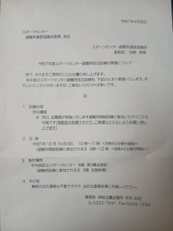 2025.10.19(日)  スポーツセンター避難所 防災訓練のお知らせ